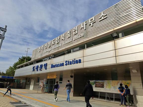 We next traveled to the Inter-Korean Transit Office, the site where one would officially depart from the Republic of Korea and begin their journey into the North. Staff walked us through the transit process, as nearly 900 South Koreans were doing daily in the early 2000s. Here, the Ministry of Unification spoke to us about South Korean development and industry projects in North Korea and how the Transit Center served as an important junction for this. Though not in operation, the Transit Office serves as a powerful symbol of modern cooperation between the two Koreas.