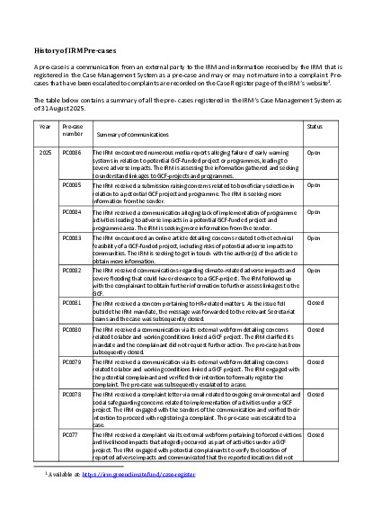 A pre-case is a communication from an external party to the IRM and information received by the IRM that is registered in the Case Management System as a pre-case and may or may not mature into a complaint. Pre-cases that have been escalated to complaints are recorded on the Case Register page of the IRM’s website. The table in the document contains a summary of all the pre-cases registered in the IRM’s Case Management System as of 31 August 2025.