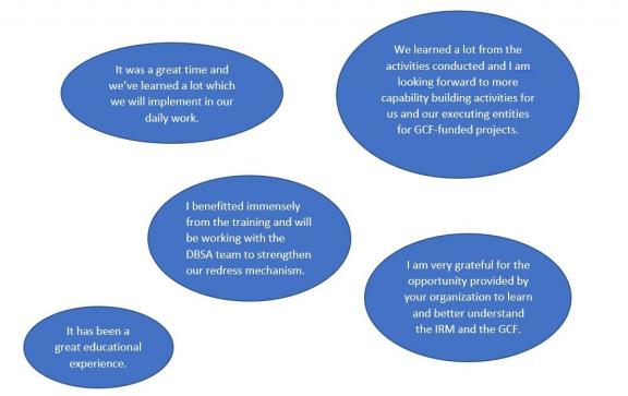 L'atelier a également servi à renforcer le partenariat GRAM (Grievance Redress and Accountability Mechanisms), une initiative de le MRI dans le cadre de sa fonction de renforcement des capacités. Ce partenariat informel vise à créer une communauté de pratique et à fournir un leadership à tous les GRAM. Ces mécanismes se sont multipliés en partie parce qu'ils sont exigés par le processus d'accréditation de GCFet aussi parce que les Principes de l'Équateur et les organismes de certification verte les exigent.