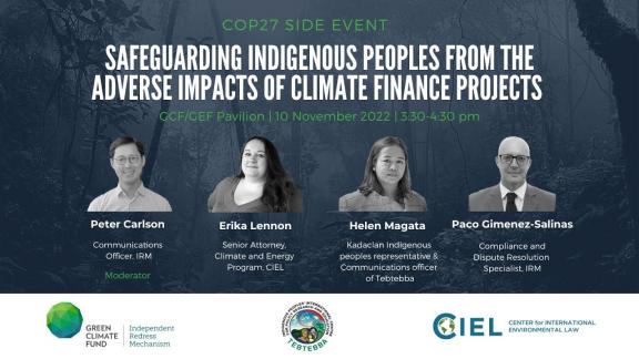 This side event at COP27, co-hosted by the Center for International Environmental Law (CIEL), the Indigenous Peoples' International Centre for Policy Research and Education (Tebtebba) and the Independent Redress Mechanism (IRM) discussed how Indigenous Peoples have been impacted by large-scale climate finance projects, and how grievance accountability entities like the IRM have helped provide recourse to Indigenous Peoples and others who have been affected by development projects.